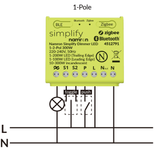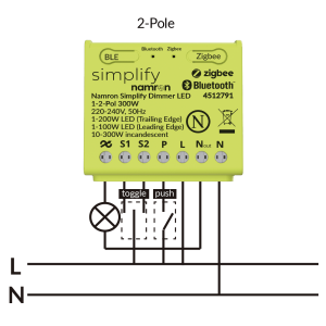 Namron Simplify Dimmer LED 1–2 Pole 300W is part of the new Namron Simplify series – developed with a focus on user-friendliness and flexibility. The dimmer allows you to choose between Bluetooth Mesh and Zigbee 3.0 and can easily be controlled via the Namron Simplify app or integrated with Athom Homey for advanced features. With support for both 1-pole and 2-pole dimming, it’s perfect for LED and incandescent lamps, giving you full control over your lighting – whether you want simple app control or advanced smart home automation.