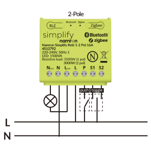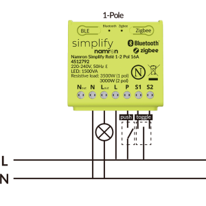 Namron Simplify Relay 1–2 Pole 16A is a powerful and flexible relay in a compact format, designed to give you full control over lighting and other electrical loads in your smart home. With support for both Bluetooth Mesh and Zigbee 3.0, you can choose how you want to connect – either directly via the Namron Simplify app or through a gateway for advanced features and remote control.